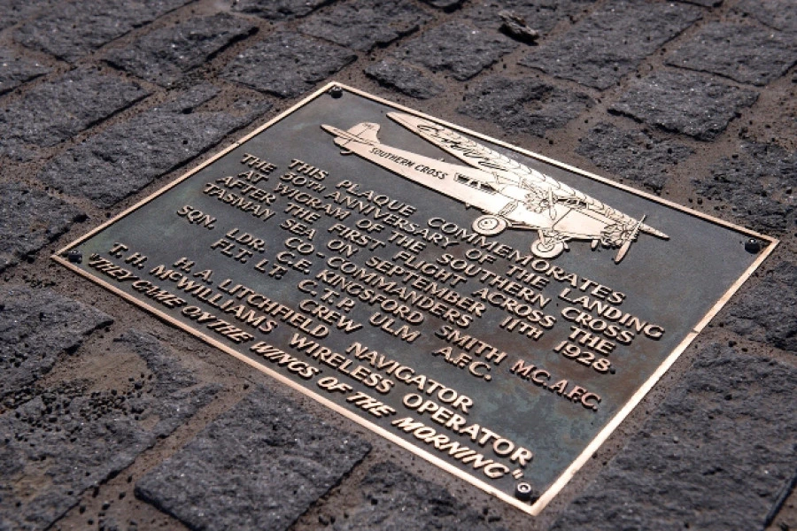A plaque on the landing site at Wigram Skies commemorates the event. The Heritage Reserve, located on Bennington Way in the George West neighbourhood, marks the actual location of the touchdown by the Southern Cross. The commemorative plaque placed nearby was originally used in 1978 to mark the 50th Anniversary of this landing.